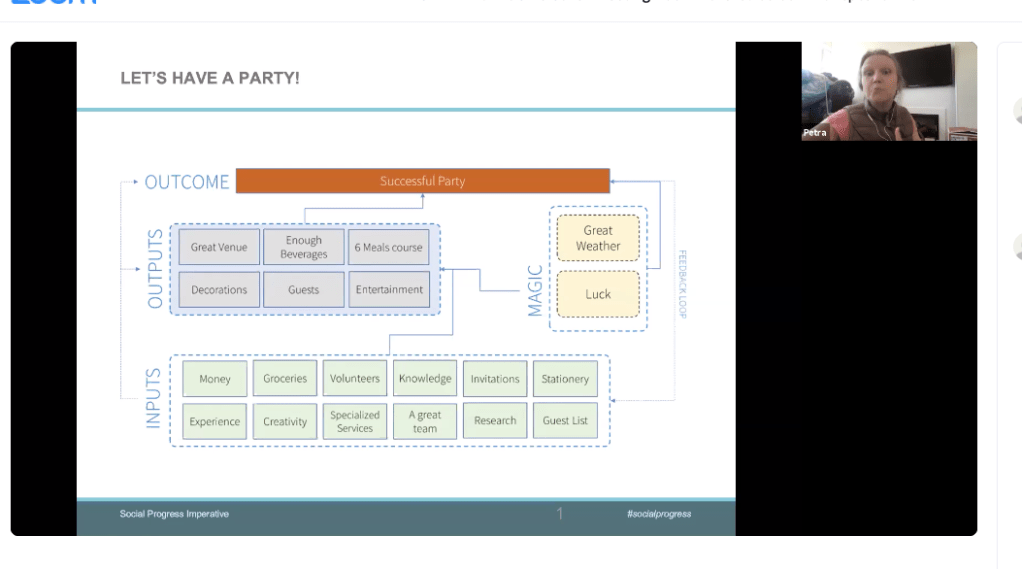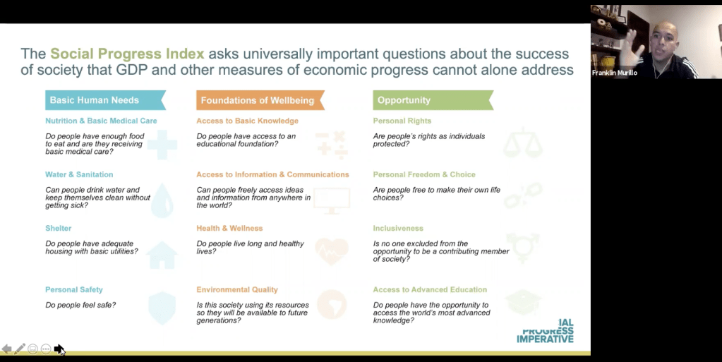 Description: The Social Progress Framework is based on very specific concepts and questions developed thorough exhaustive research. In this final session we will revise the design principles of the SPI when selecting the indicators and we will discuss the next steps on the project